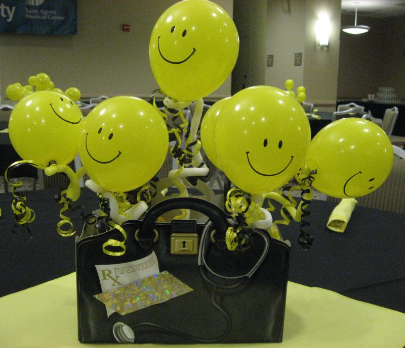 SMILEY FACE BALLOONS IN DOCTOR BAG CENTERPIECE